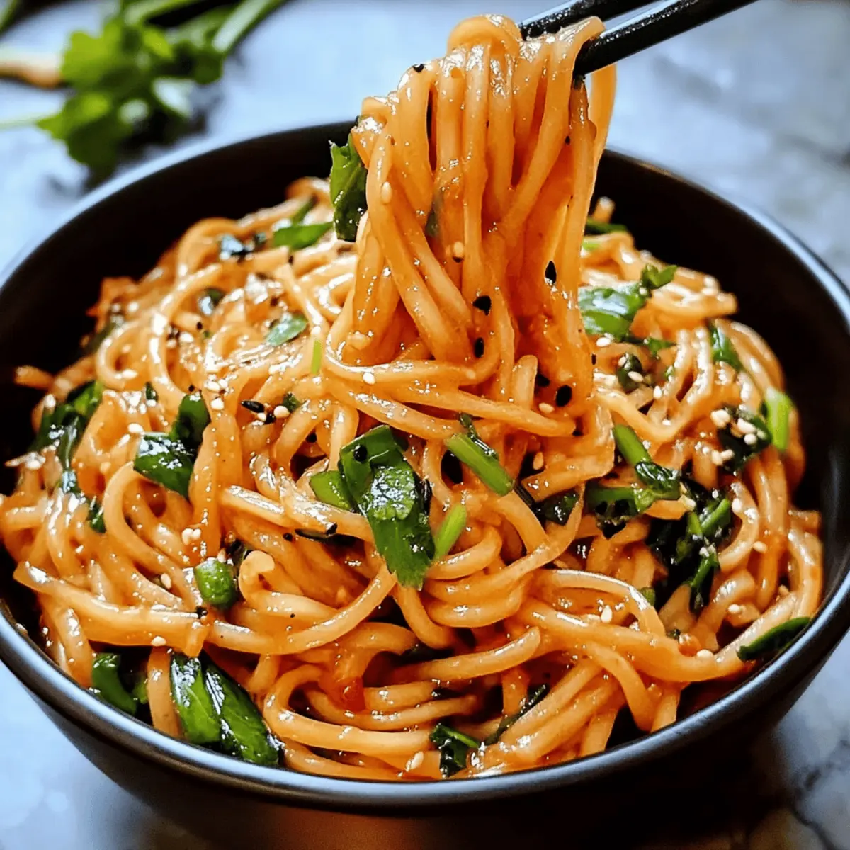 Once the noodles are cooked, drain them and add them directly to the bowl with the sauce. Gently toss the noodles in the sauce until they are evenly coated, allowing the vibrant red hue of the sauce to envelop each strand. Serve immediately in bowls topped with fresh coriander and spring onions, and a drizzle of homemade crispy chilli oil for an extra flavor kick.