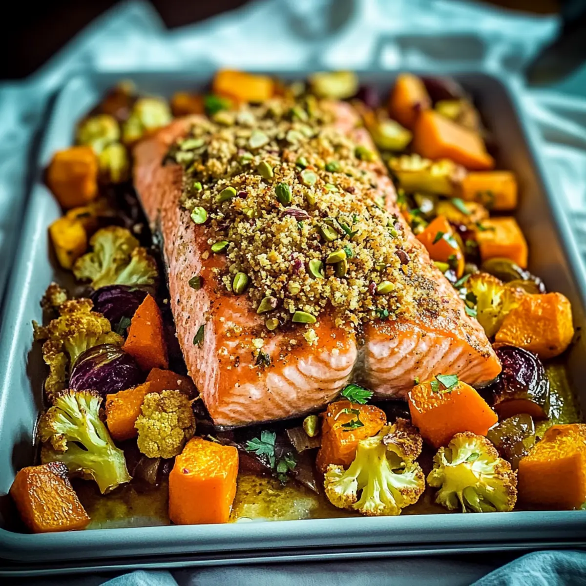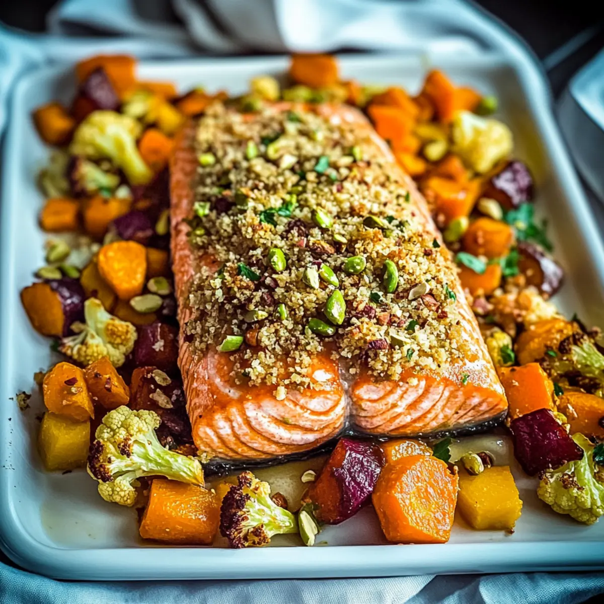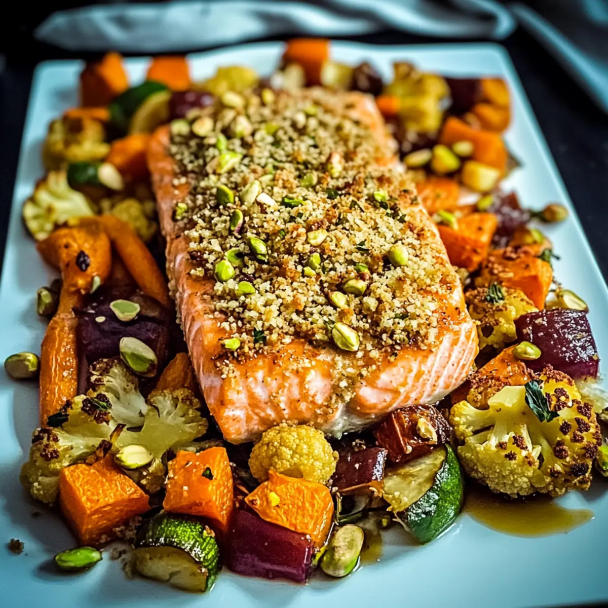 As the aroma of roasting vegetables wafts through the kitchen, it brings back memories of family dinners packed with laughter and warmth. Today, I’m excited to share my recipe for Baked Salmon with Pistachio Crumb & Colorful Roast Veggies—an easy yet elegant dish that anyone can master. Not only is this recipe a feast for the eyes, showcasing vibrant, seasonal produce, but it’s also a quick dinner option, perfect for those busy weeknights when time is scarce. The omega-3-rich salmon, topped with a crunchy pistachio crust, pairs beautifully with caramelized veggies, making every bite both satisfying and healthy. Ready to impress your loved ones and elevate your dinner game? Let’s dive into this delightful recipe!