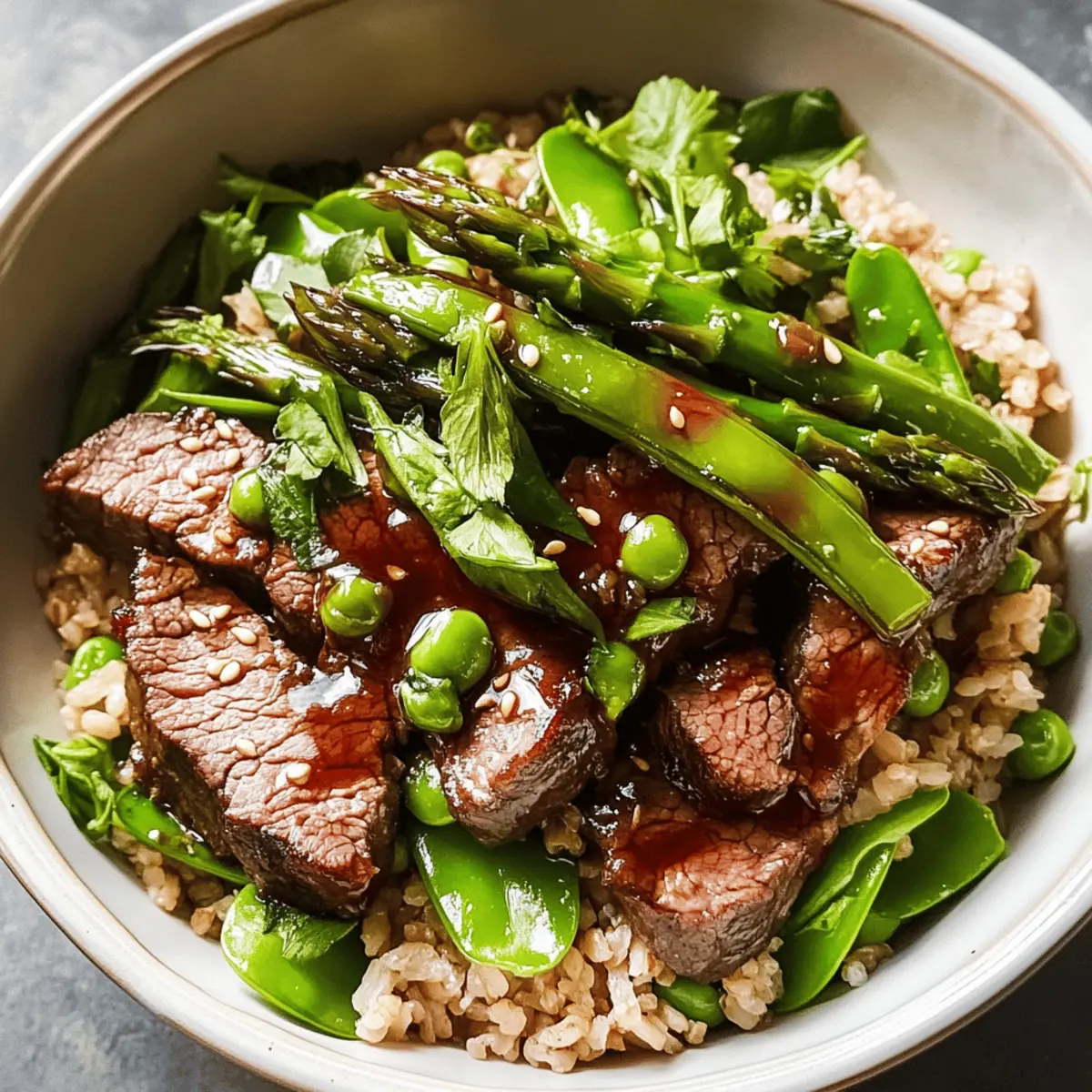 - To serve, distribute the cooked rice evenly into bowls. Top each bowl with the sliced beef, blanched asparagus, and sugar snap peas. Add a handful of 100g mixed salad leaves for extra freshness and crunch. Finally, drizzle the prepared soy mirin dressing generously over each bowl.