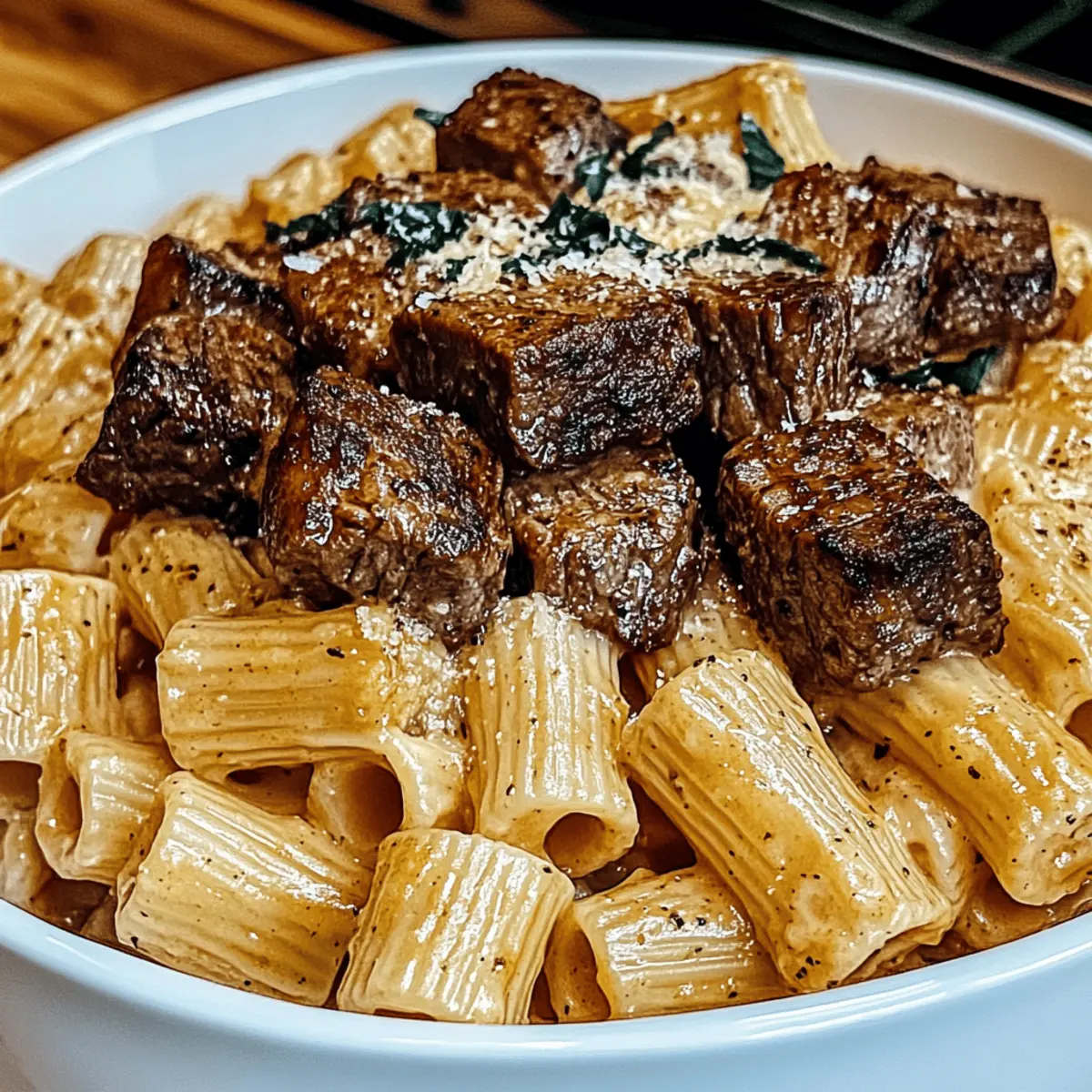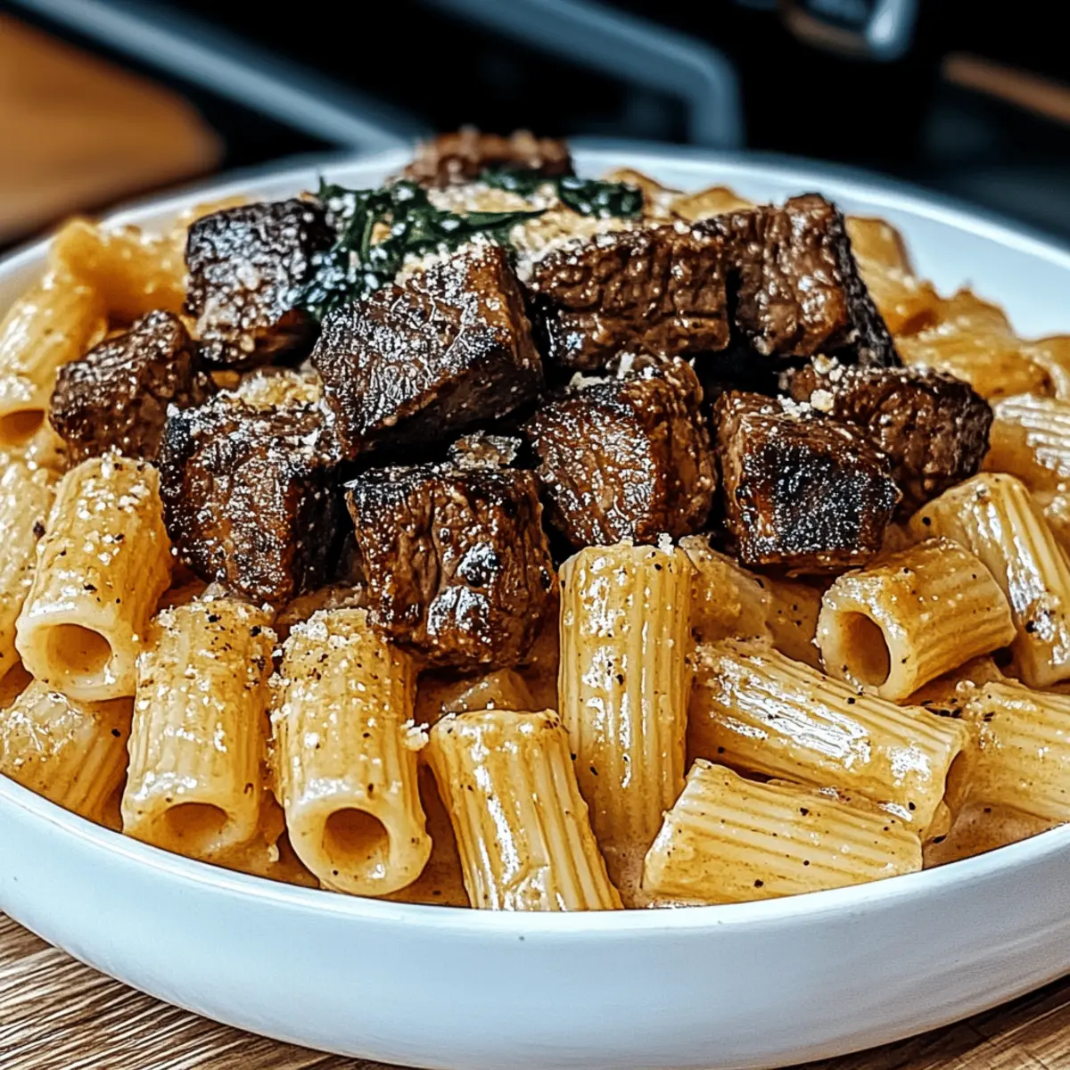 Before serving, carefully fold the seared steak tips back into the pan with the creamy rigatoni. Let them heat through for about 1-2 minutes, ensuring every bite has both steak and pasta mingling together in the sauce.