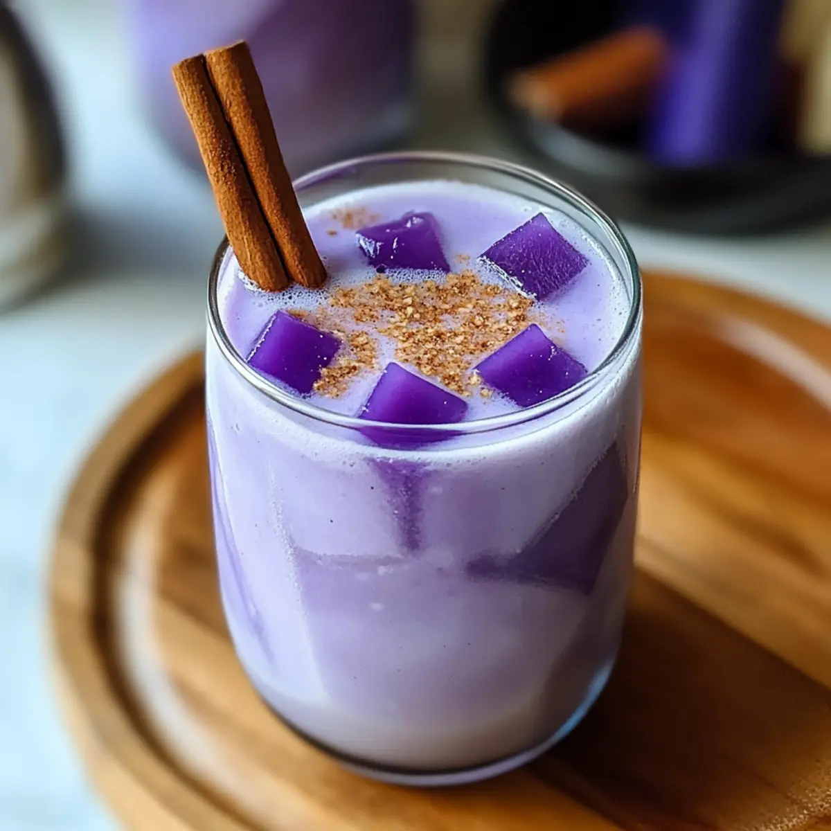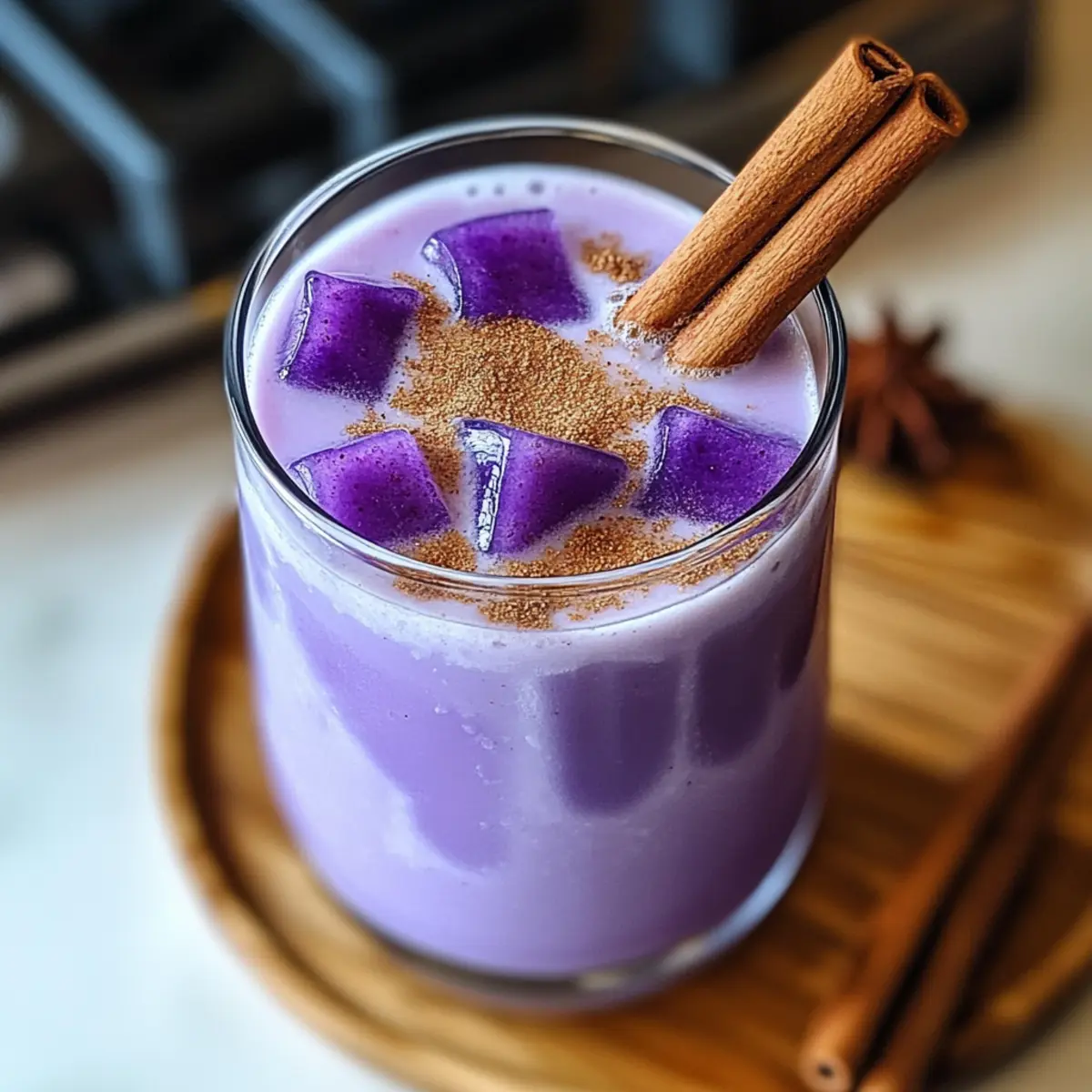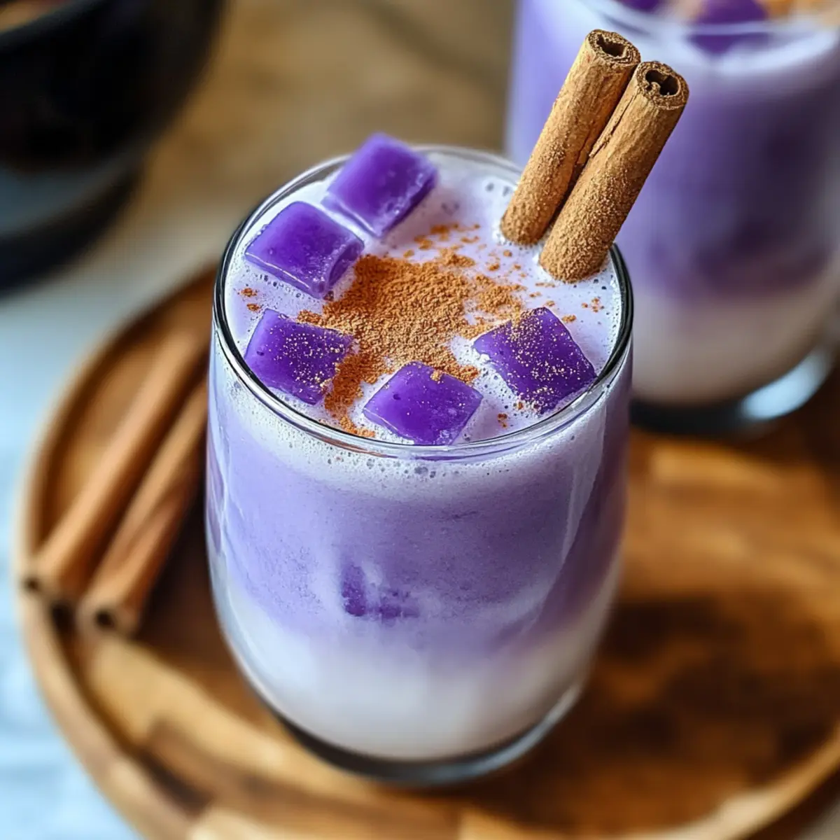 Fill tall glasses with ice and pour the Ube Horchata mixture over the top. For an inviting finish, sprinkle a dash of ground cinnamon on each serving or garnish with a cinnamon stick. This beautifully presented drink is not only refreshing but also perfect for summer gatherings or a cozy afternoon treat.