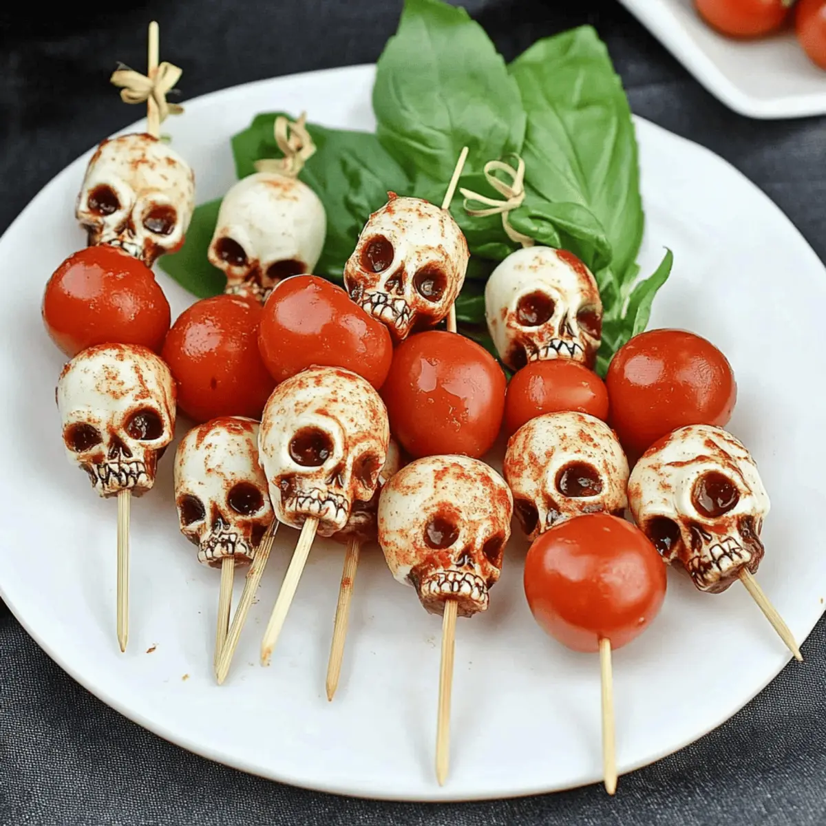To keep them as fresh as possible, I’d suggest preparing these skewers no more than an hour ahead of your event. If you need to prep earlier, you can make the mozzarella skulls ahead of time—just remember to chill them properly and assemble them shortly before serving for the best flavor!