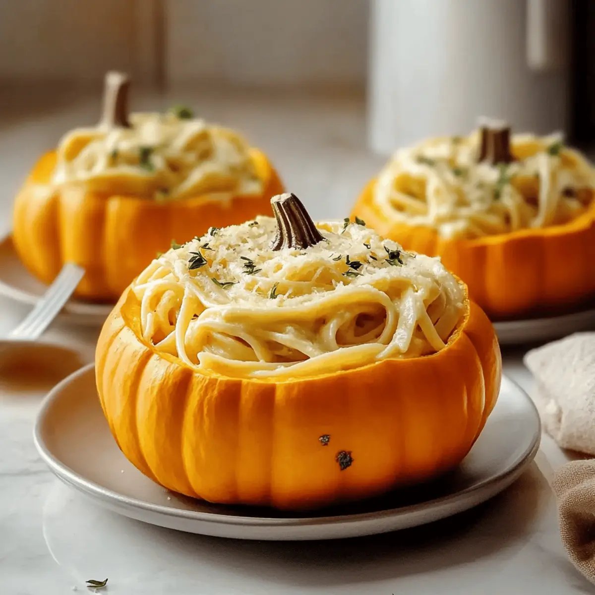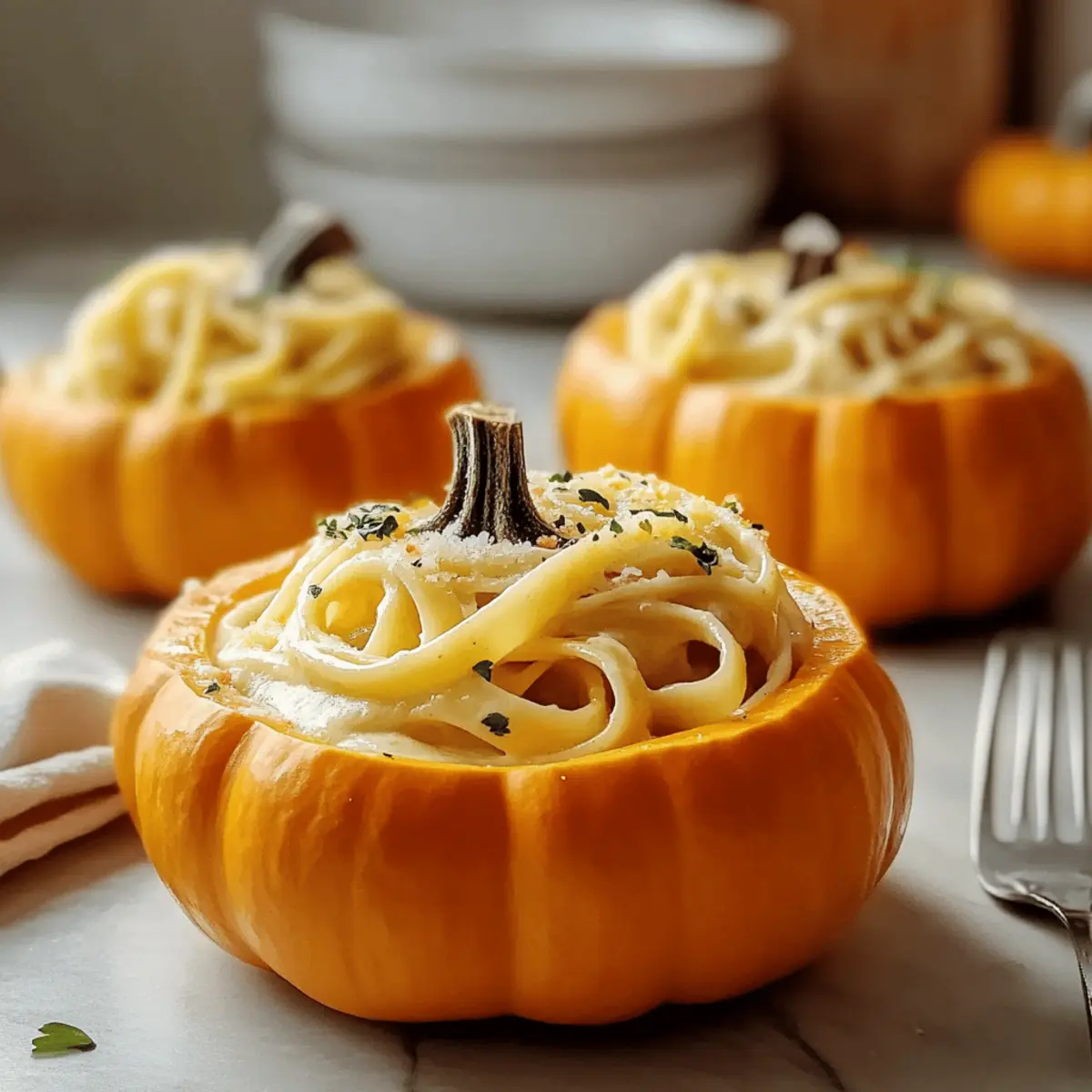 Carefully remove the roasted pumpkins from the oven, ensuring they are cool enough to handle. Use tongs or a large spoon to fill each pumpkin with the creamy pasta mixture, twirling the fettuccine into lovely nests. Allow the rich pasta to spill slightly over the edges, creating a whimsical presentation for your guests.