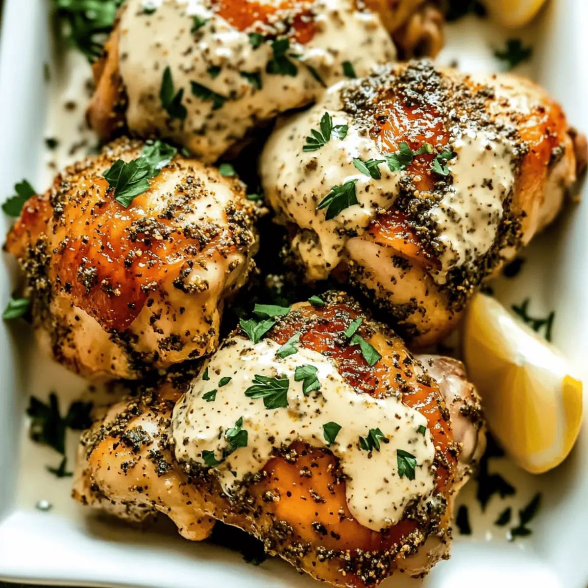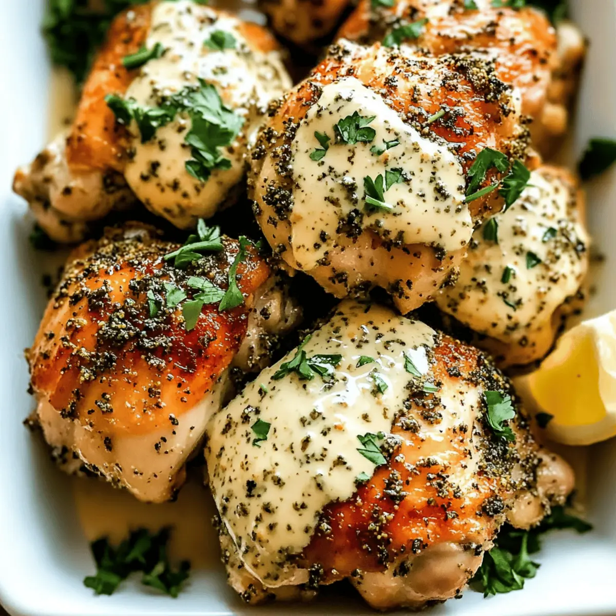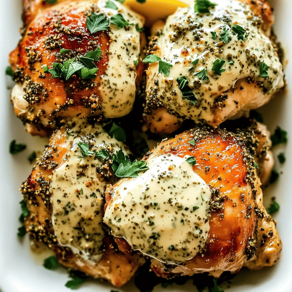 Once fully cooked, remove the chicken from the oven and let it rest for a few minutes. Garnish generously with chopped fresh parsley for a vibrant touch. Serve the thighs with lemon wedges on the side, allowing your guests to squeeze the fresh juice over the chicken for an extra burst of flavor. Enjoy this delightful meal that captures the essence of Mediterranean cuisine!