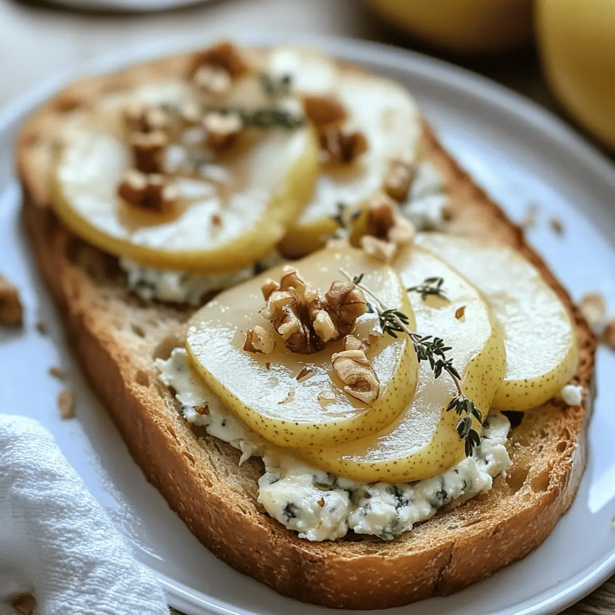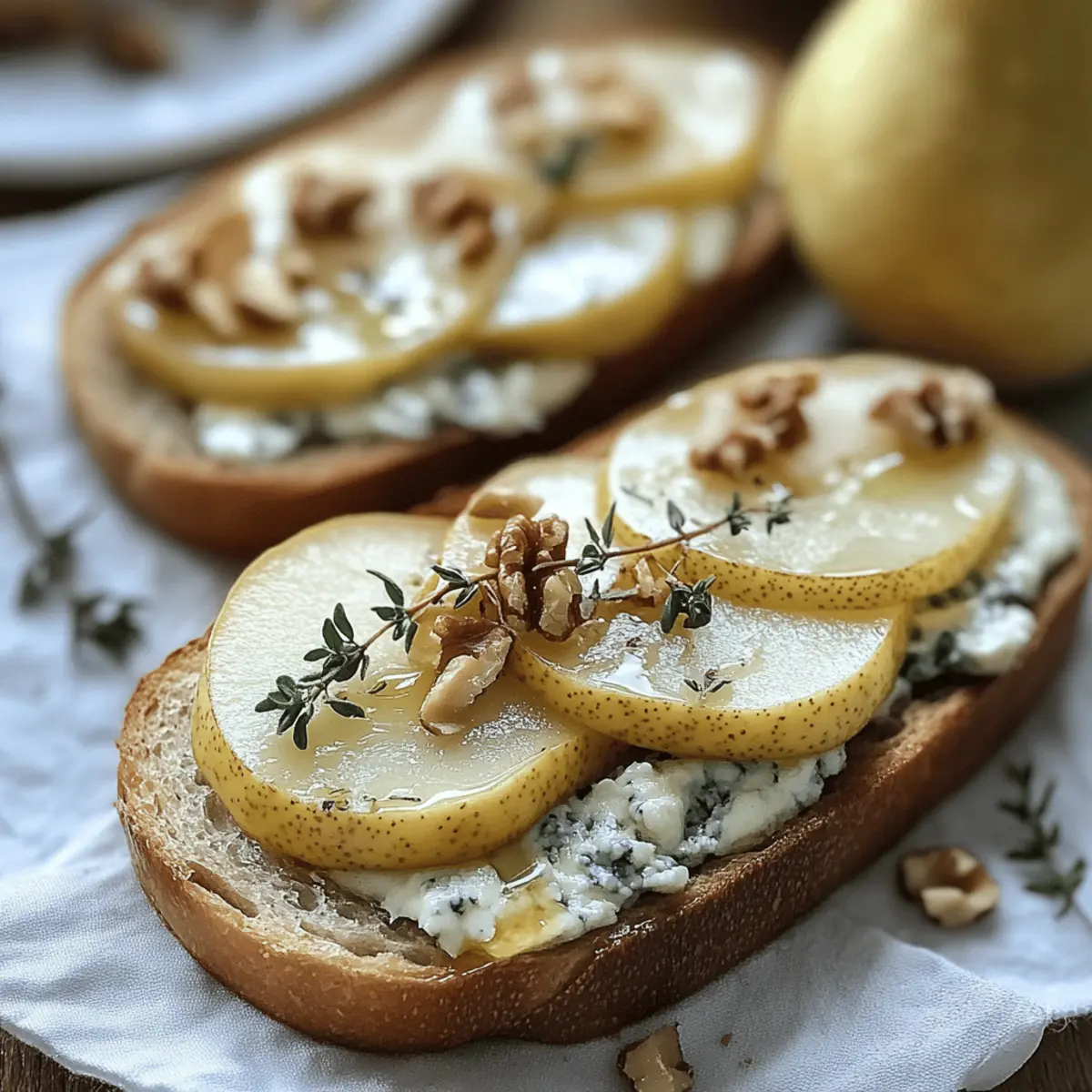 Finally, sprinkle fresh thyme leaves over the top of the toasts along with the toasted walnuts. The herbaceous aroma will add depth to the flavors of the Savory Pear and Gorgonzola Cheese, making each bite a wonderful experience.
