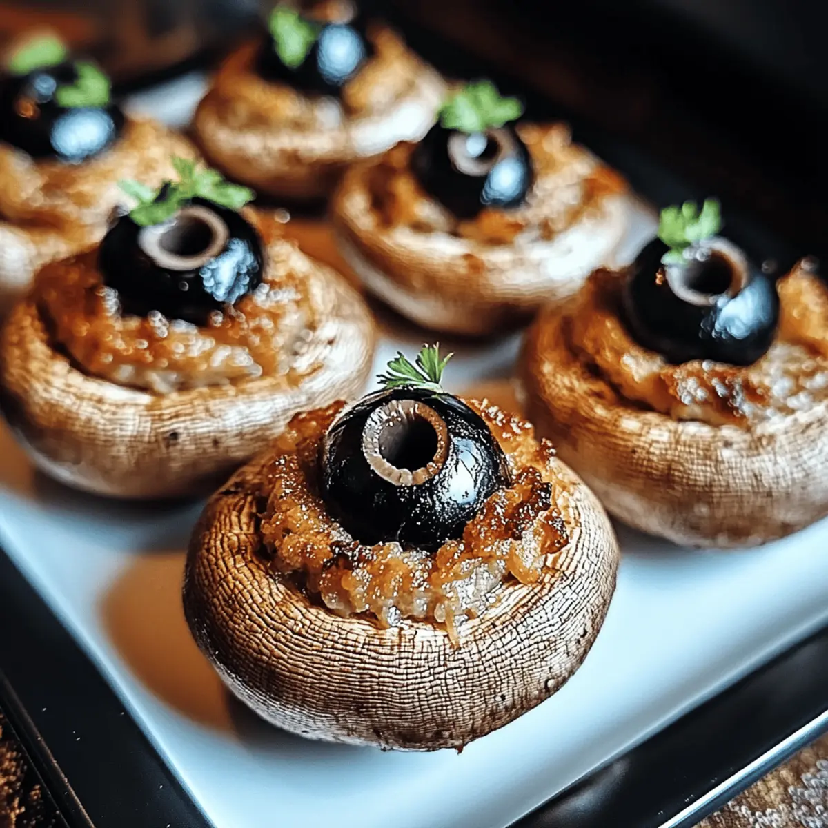 For the finishing touch, press a small pitted olive into the center of each stuffed mushroom cap. This adds a fun and creepy effect, resembling pupils for your Stuffed Mushroom Eyeballs, making them visually striking and perfect for any Halloween gathering.